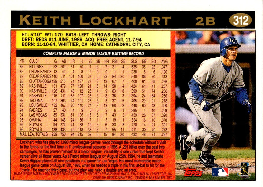 Introducing the 1997 Topps Keith Lockhart #312 Kansas City Royals trading card. This card celebrates the career of the MLB infielder, who played for the Royals that year. You'll love the vibrant colors and clear images, as well as the detailed stats on the back. This card is an essential piece for any Keith Lockhart or Royals fan, and is sure to add a unique touch to your sports memorabilia collection. Don't miss out on this great card - grab yours today!