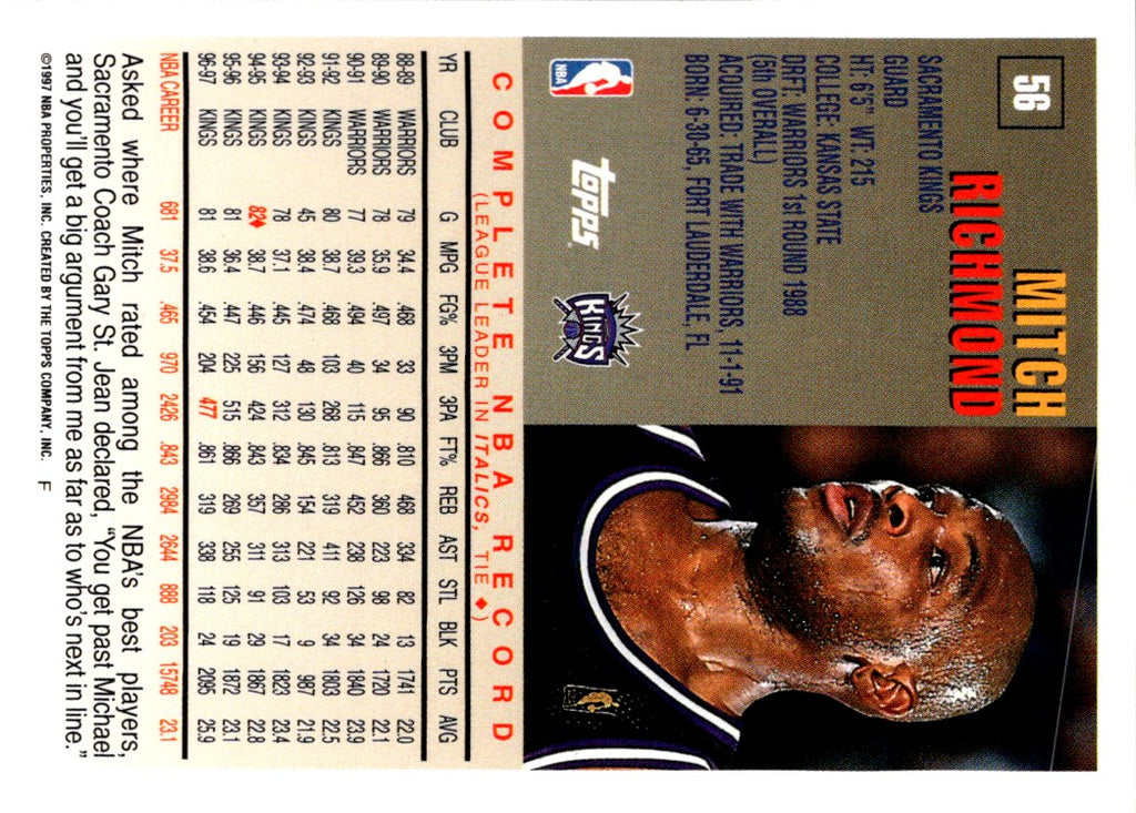 This 1997 Topps Mitch Richmond #56 card from the Sacramento Kings is a great collectible for any basketball fan. It features a high quality color image of Richmond in action, complete with his name and team logo in the corner. This card is a must-have for any fan of the Kings or Richmond, so get it now before it's gone!