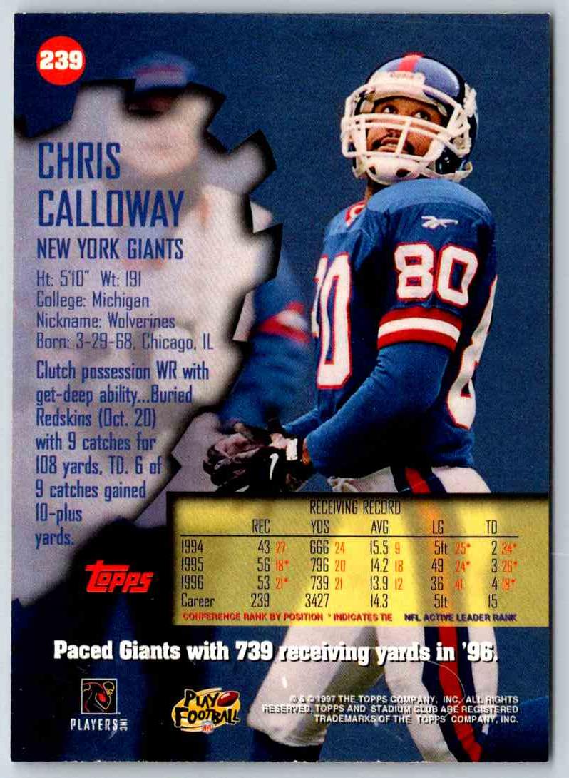 This 1997 Topps Stadium Club Football Chris Calloway #239 is a must-have for any Football fan! Featuring crisp and vibrant images of the star wide receiver, this card showcases his intricate details and dynamic action poses. A perfect addition to your collection, this card was issued in the Stadium Club series and is sure to be a show-stopper. Add Chris Calloway to your collection today!