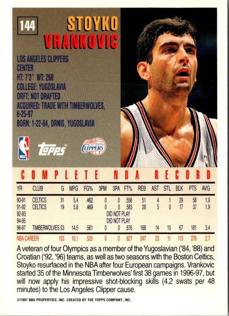 This 1997 Topps Stojko Vrankovic card #144 features the Los Angeles Clippers star in action! This card is a great addition to any basketball card collection and will make a great gift for any Clippers fan. It is printed on a high-quality card stock and is sure to last a lifetime! Don't miss out on the chance to add this card to your collection.