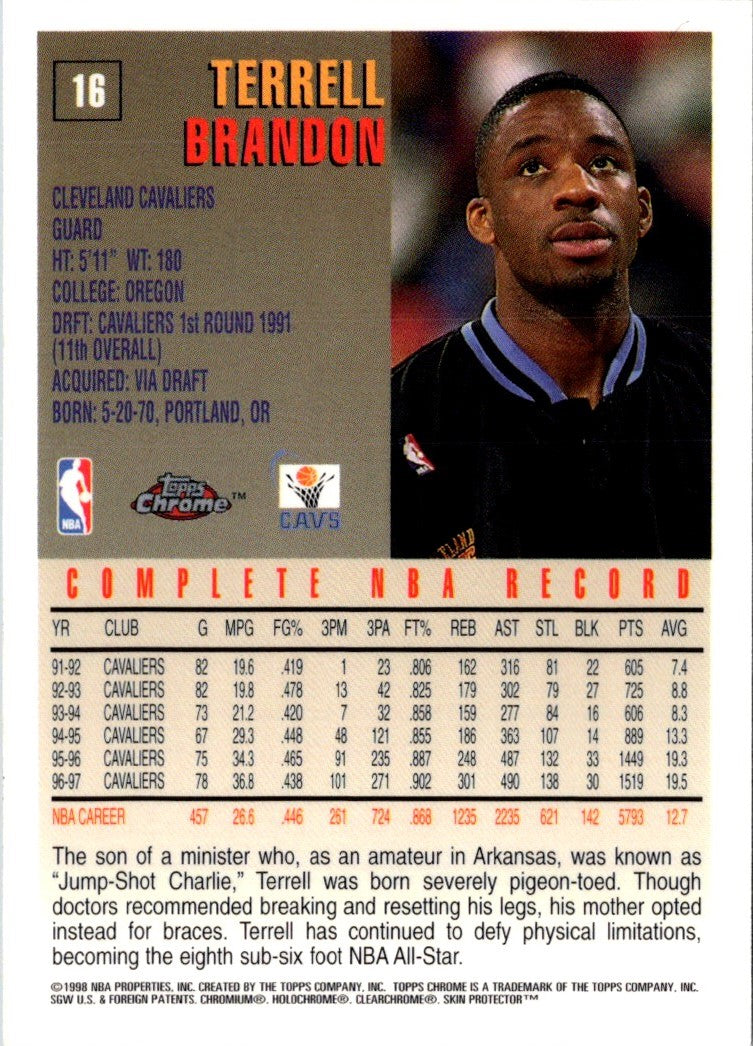 The 1997 Topps Terrell Brandon #16 Cleveland Cavaliers card is a must-have for any basketball fan. This card spotlights one of the most exciting players in the NBA, the Cavaliers' Terrell Brandon. With vibrant colors and a classic design, this card is sure to stand out in any collection. It captures the energy and excitement of the game and will be a great addition to any fan's memorabilia. With its reliable construction and iconic design, this card is sure to last for years to come. Add this card to your collection today and remember the great moments of Terrell Brandon with the Cavaliers!