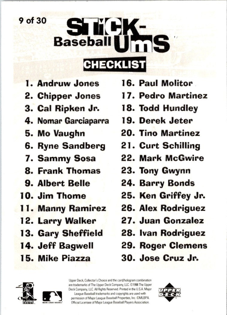 This 1998 Collector's Choice Stickums Albert Belle #9 is an essential item for the ultimate Chicago White Sox fan! Featuring a glossy card with a full-color image of Belle in his iconic Sox uniform, this collector's item is perfect for display. Enjoy a piece of baseball history with this iconic card and show your White Sox pride!