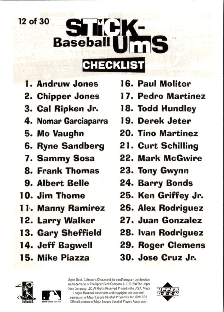 This 1998 Collector's Choice Stickums Larry Walker #12 Colorado Rockies card is perfect for any Rockies fan or card collector! Featuring a classic image of the legendary Larry Walker, this card is sure to become a treasured item in any collection. The card is printed on quality card stock and features a glossy finish. It also comes complete with a protective sleeve so you can keep it in mint condition for years to come. Add this card to your collection today and become a part of the Rockies' history!