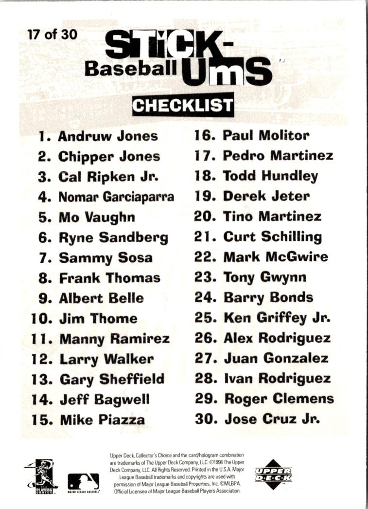 The 1998 Collector's Choice Stickums Pedro Martinez #17 Montreal Expos card is a must-have for any Expos fan. Featuring a full-colour image of Martinez in his Expos jersey, this card is a great way to show your love of the team. The card is printed on a high-quality cardstock and is sure to last for years to come. Add it to your collection today and show your support for the Expos.