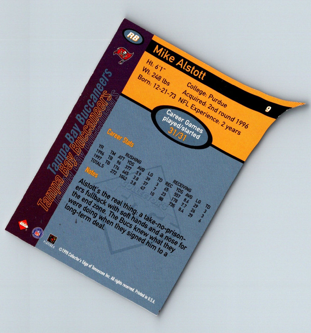 Score a piece of football history with this 1998 Collector's Edge First Place Mike Alstott #9 Tampa Bay Buccaneers card! This card is the perfect addition to any collection, providing a vivid image of Alstott in action. Alstott was an iconic fullback for the Buccaneers, known for his powerful running style. This card captures Alstott in all his glory, surrounded by a stunning gold border. Own a piece of NFL history with this 1998 Collector's Edge First Place Mike Alstott #9 Tampa Bay Buccaneers card today!