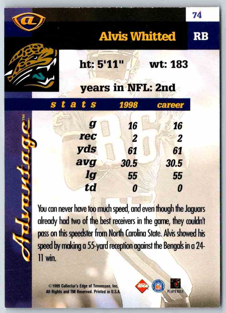 This 1998 Edge Alvis Whitted #74 card is a must-have for all die-hard football fans. With a glossy finish and bold colors, this card is sure to stand out in any collection. Featuring a full-color image of Whitted in action, this card is a great way to show your pride for your favorite NFL team. The back of the card includes a detailed biography of Whitted, as well as a list of his career accomplishments. Whether given as a gift or kept for yourself, this card is sure to be cherished for years to come.