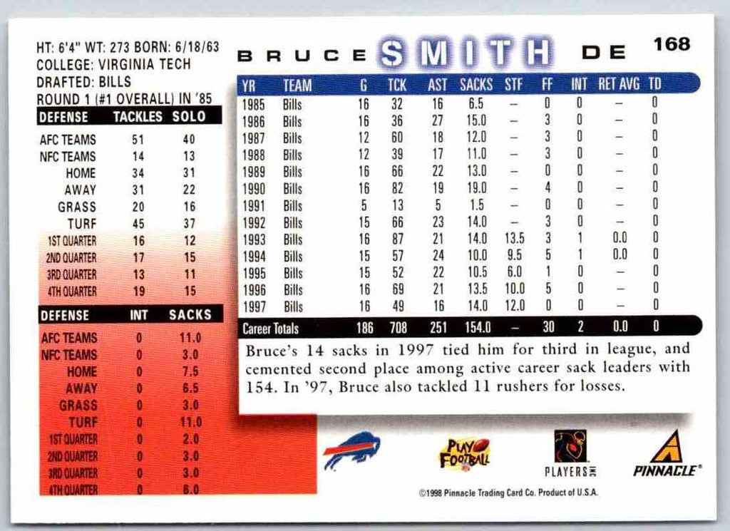 This stylish 1998 Edge Bruce Smith #168 football card is a must-have for any true collector of the NFL. It features a dynamic image of the legendary Hall of Fame defensive end, and the back features his career highlights and stats. An absolute must-have for any Washington Redskins fan, this card is a great way to commemorate one of the greatest defensive players of all time. Add this card to your collection and show your appreciation for one of the best to ever play the game.