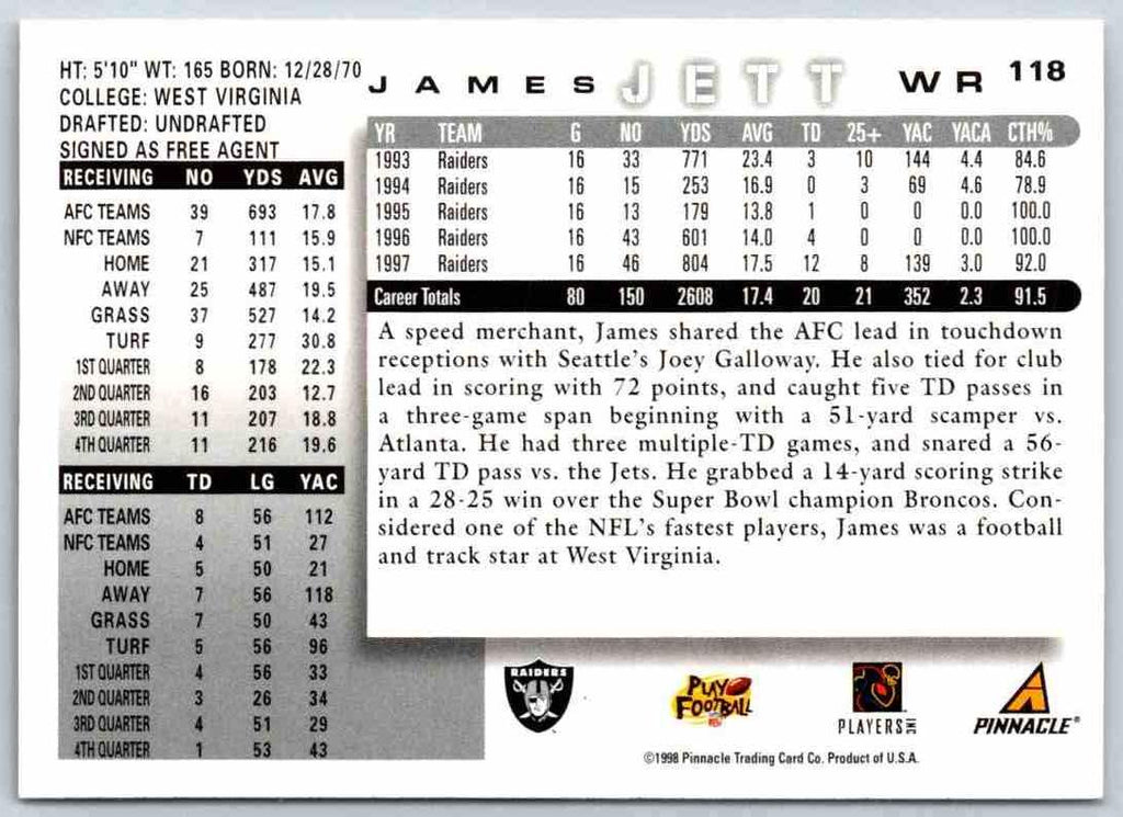 The 1998 Edge James Jett #118 is an iconic football card that celebrates the career of the legendary wide receiver. Featuring a full color, high-resolution image of Jett in his Oakland Raiders uniform, this card is an essential addition to any serious collector's arsenal. The card is printed on high-quality, glossy paper for maximum durability and features a glossy coating for added protection. With its vibrant colors and crisp details, this card is the perfect way to commemorate the legacy of James Jett. Add this card to your collection today and show your support for one of the all-time greats!