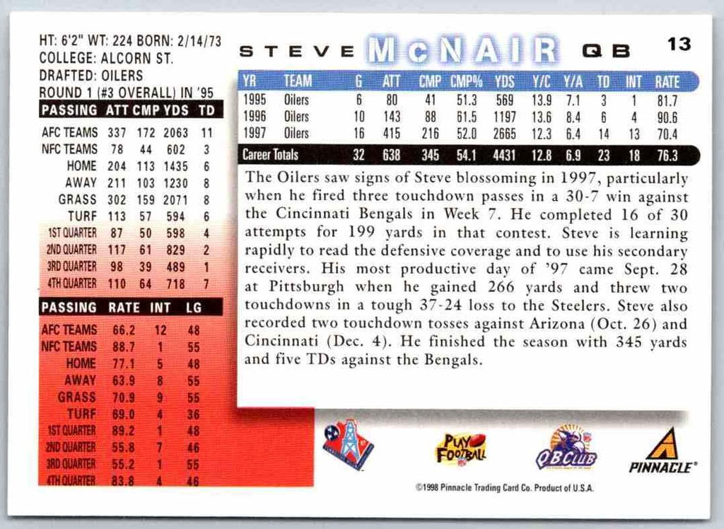 This 1998 Edge Steve McNair #13 is the perfect item for any Titans fan. It's a unique collectible that features a great action photo of the quarterback in his prime. It features a full-color picture of McNair with a detailed biography on the back. The card is officially licensed by the NFL and is a great addition to any collection. Show off your love for your favorite team and player with this must-have item.