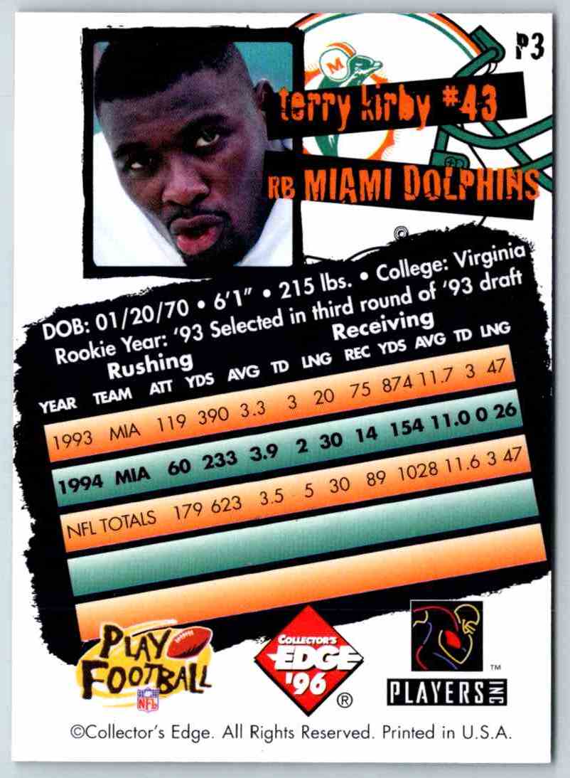 This 1998 Edge Terry Kirby P3 card is a great addition to any football card collection. Featuring a beautiful full-color image of Terry Kirby on the front, this card is sure to stand out from the crowd. The back of the card contains stats, vital information and a detailed bio of the three-time Pro Bowl running back. This card is a must-have for any fan of the NFL or the Miami Dolphins. Show your support for Terry Kirby with this unique and collectible card.