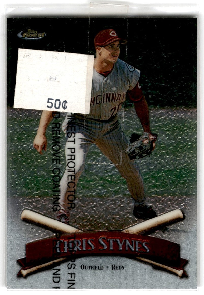 This 1998 Finest Chris Stynes card #121 from the Cincinnati Reds is a great choice for any baseball card collector. This card features vibrant colors and a great picture of Stynes in action. The card's back also contains a detailed biography of the player along with a list of his career highlights. Add this card to your collection today and show your support for the Cincinnati Reds!