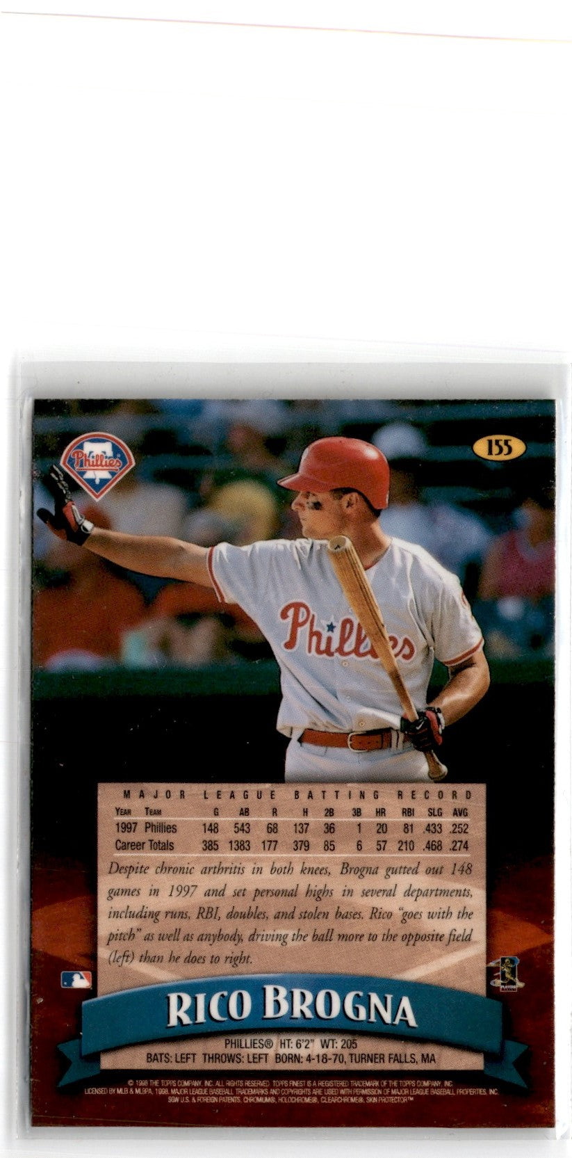 This 1998 Finest Rico Brogna #155 Philadelphia Phillies card is a must-have for any Phillies fan! Featuring an action shot of the beloved Phillies first baseman, this card is sure to bring back memories of Brogna's spectacular performances during his time with the team. With sharp, vivid colors and a glossy finish, this card is sure to look great in any collection. Don't miss your chance to own a piece of Phillies history - pick up this card today!