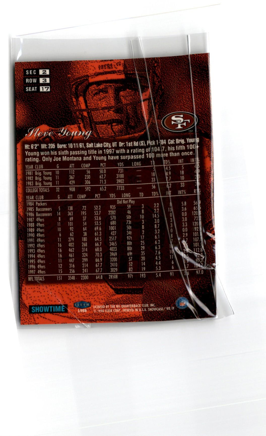 This 1998 Flair Showcase Steve Young #17 San Francisco 49ers card is a must-have for any 49ers fan! Celebrate the legacy of one of the greatest quarterbacks to ever play with this card depicting Young in his classic 49ers uniform. The card is printed on high-quality stock and features a glossy finish and excellent detail. It's an ideal way to show off your team pride and commemorate a true NFL legend.