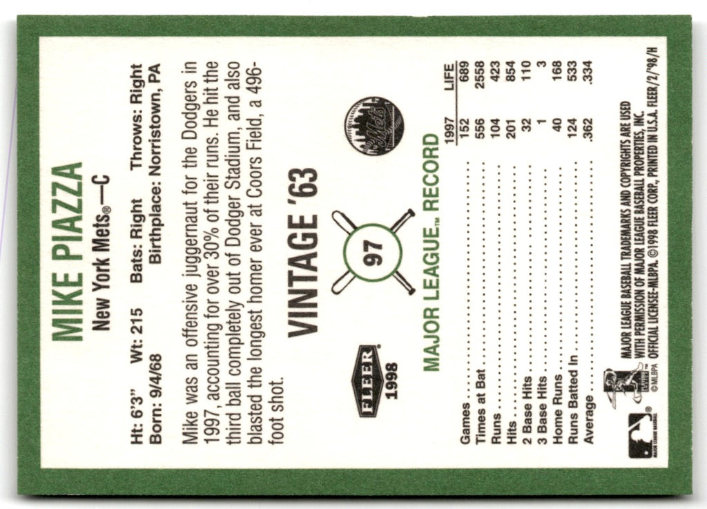 Description: 1998 Fleer Tradition Vintage Mike Piazza #97