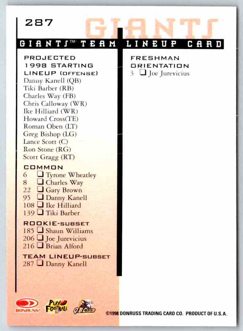 This 1998 Leaf Rookies and Stars Danny Kanell #287 card is a must-have for any sports collector! Featuring a full-color photo of the former NFL quarterback in action, this card is sure to bring a splash of nostalgia to any collection. The card is printed on high-quality card stock, with a glossy finish for a lasting impression. Don't miss out on the opportunity to add this classic sports card to your collection today!