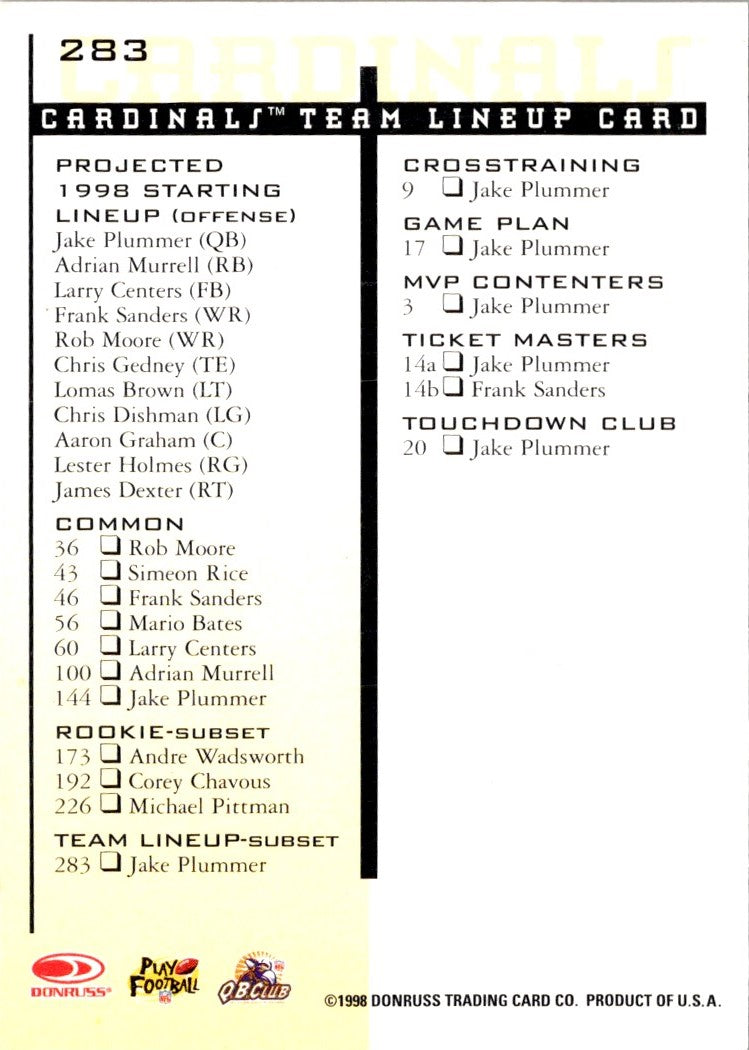 If you're a fan of the Arizona Cardinals, then you'll definitely want to add this 1998 Leaf Rookies & Stars Jake Plummer #283 card to your collection. This card features Plummer in his classic Cardinals uniform, looking ready to take the field. The reverse of the card contains a brief biography and career highlights, making this card a great way to commemorate Plummer's career. Don't miss out on your chance to add this perfect piece of football memorabilia to your collection.