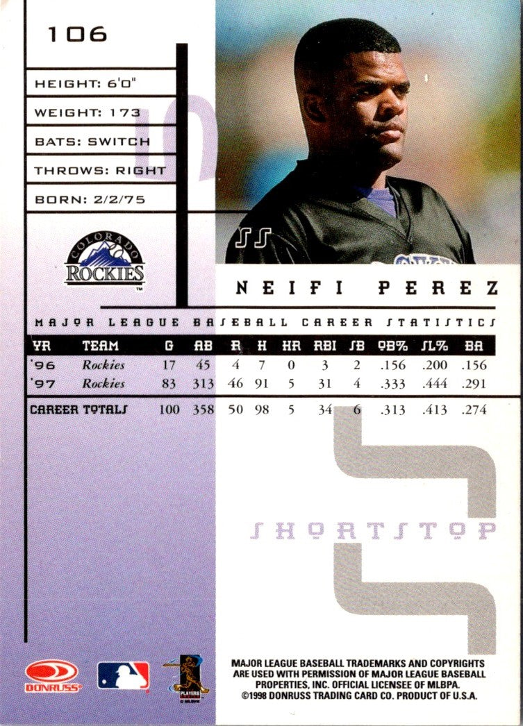 Description: 1998 Leaf Rookies & Stars True Blue Neifi Perez #106