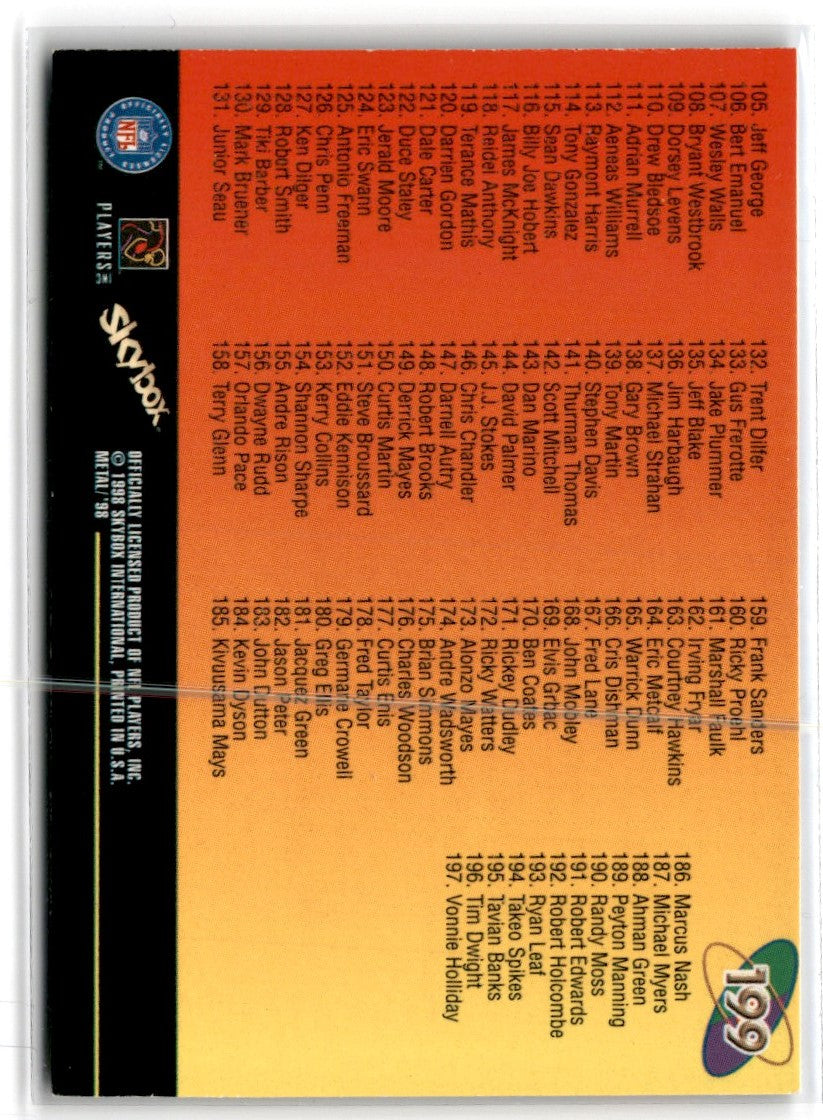 This 1998 Metal Universe Jerry Rice #199 card from San Francisco 49ers is a must-have for any collector of Jerry Rice memorabilia. The card features a glossy image of Rice in his 49ers uniform, with a bright blue background and bold text. The card is in great condition and will make a great addition to any collection. With this card, you can show your support for one of the greatest football players of all time!