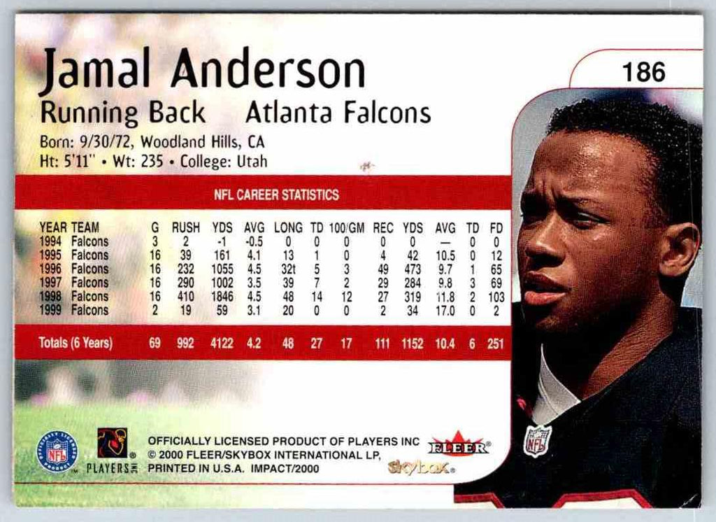 This 1998 Pacific Jamal Anderson #186 trading card is the perfect addition to any football fan's collection. Featuring the All-Pro running back in his Atlanta Falcons uniform, this card features a full-color action shot of Anderson in mid-stride. With crisp corners and vibrant colors, this card is sure to impress any collector. The back features a detailed biography of Anderson's impressive career, making it a great way to learn more about one of the game's most dominant players. Add this card to your collection today and show your support for Jamal Anderson.
