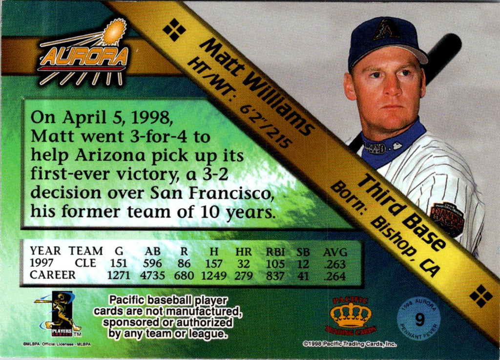 This 1998 Pacific Matt Williams #81 Cleveland Indians card is perfect for any fan or collector looking to add a unique piece to their collection. It features a bold and vibrant design with a crisp image of the popular baseball player. Williams' signature appears on the front, adding an extra layer of authenticity to the design. The card is in excellent condition with no signs of wear or damage. Add this classic card to your collection now and celebrate the success of one of the greats!