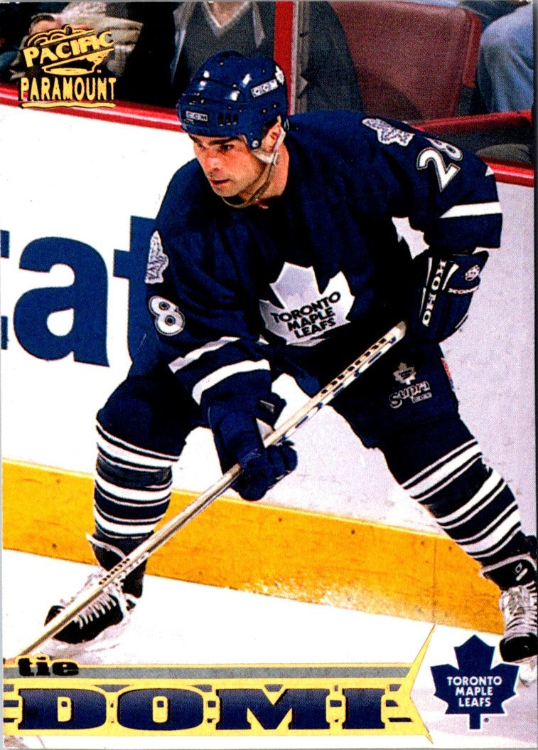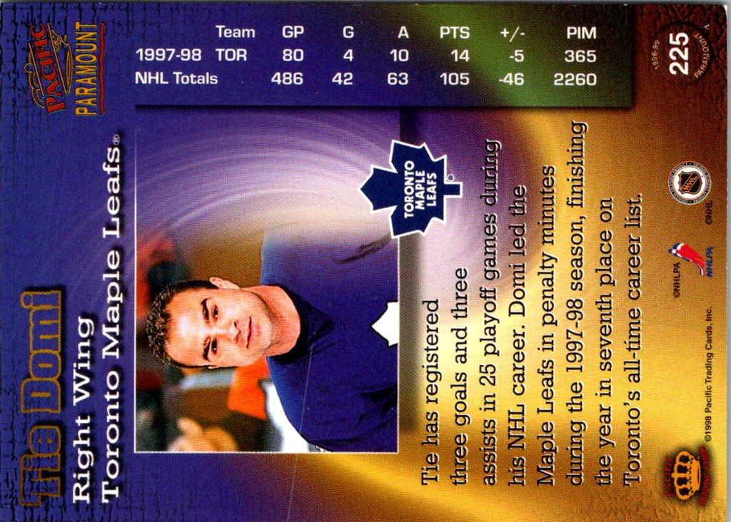 This 1998 Pacific Paramount Copper Tie Domi #225 card is a must-have for any Toronto Maple Leafs fan! Featuring vibrant colors and intricate detailing on the face of the card, it's sure to stand out in any collection. Tie Domi was a beloved member of the Maple Leafs and his 1998 Pacific Paramount card is a great way to commemorate his career. Whether you keep it for yourself or give it as a gift, this card is sure to please!