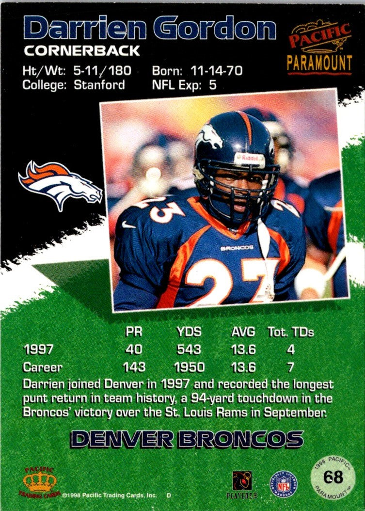 This 1998 Pacific Paramount #68 Darrien Gordon Denver Broncos card is a must-have for any football fan. Featuring a high-quality image of the legendary cornerback, this card is sure to become the centerpiece of your collection. With bold colors and a design that pops, you can display this card with pride. Add this card to your collection today and show off your Broncos pride!