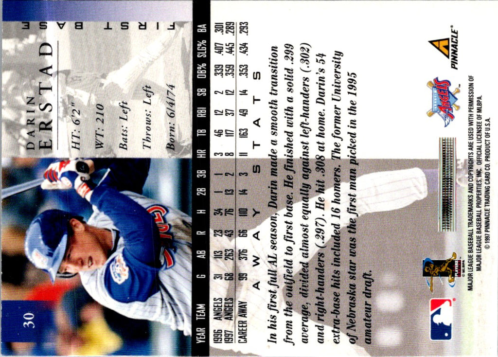 This 1998 Pinnacle Darin Erstad #30 Anaheim Angels card is an essential for any baseball card collector. Featuring a photo of Erstad in his Angels uniform, this card captures the excitement of the Angels' 1998 season, a year they made it to the playoffs and Erstad was named an All-Star. It's a great way to honor one of the most popular players in the history of the franchise. Add this piece to your collection today!