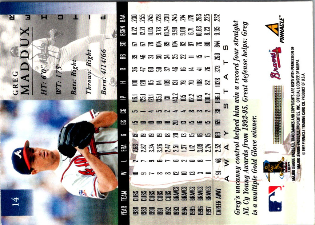 Description: 1998 Pinnacle Stats Greg Maddux #14