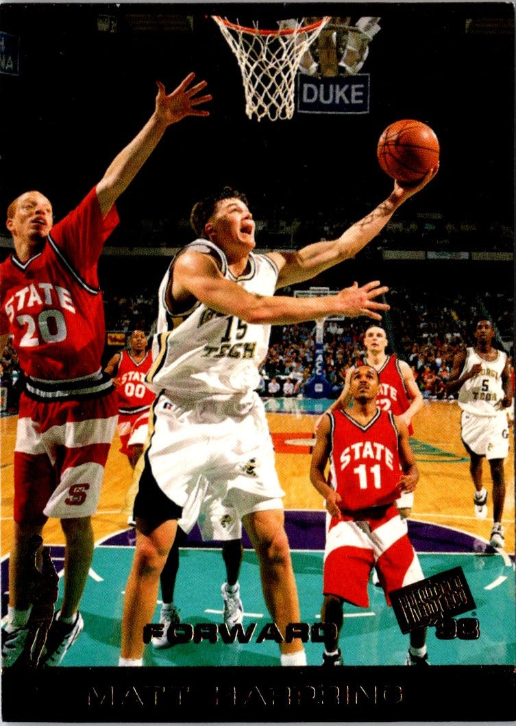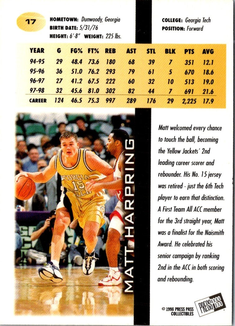 This 1998 Press Pass Matt Harpring #17 Georgia Tech Yellow Jackets card is a great addition to any Yellow Jacket fan's collection. Featuring a dynamic portrait of Harpring in action, the card also includes a detailed biography and career highlights section. With a brilliant yellow and white background, this card captures the spirit of Georgia Tech and Harpring's impressive accomplishments. The perfect way to show your support for The Yellow Jackets and to remember the legacy of Matt Harpring.