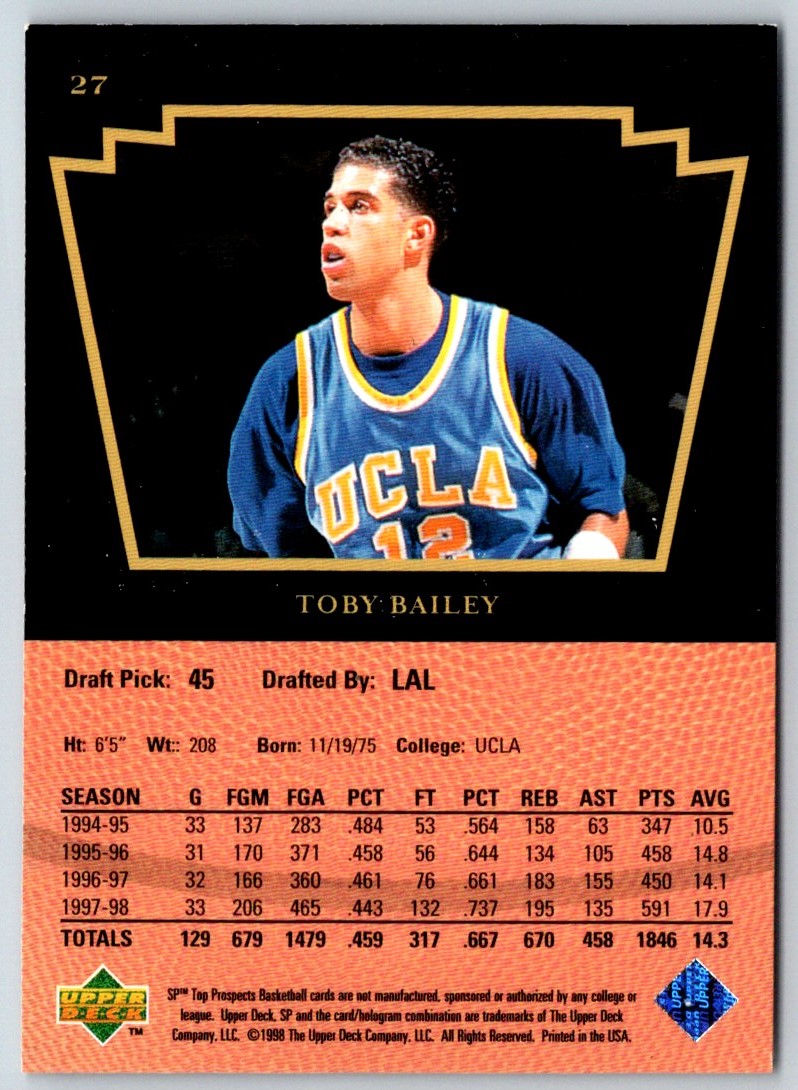 The 1998 SP Top Prospects Toby Bailey #27 UCLA Bruins/Los Angeles Lakers card is a must-have for any basketball fan. It features an action shot of Toby Bailey in his Bruins uniform, as well as a prominent Lakers logo. The card is printed on high-quality stock and features vibrant colors, making it an excellent addition to any collection. This card is an essential part of any basketball fan's collection and is sure to become a favorite in no time.