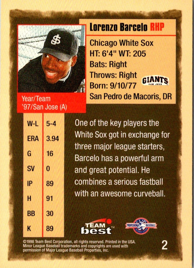 This 1998 Team Best Lorenzo Barcelo #2 San Jose Giants baseball card is a great addition to any fan's collection. It captures the legendary Giants player in all his glory, with bright colors and a classic design. This card features Barcelo in his San Jose Giants uniform, with his signature on the front. The back of the card features a brief biography of the player, as well as his stats and accomplishments. This card is sure to bring any collector a sense of nostalgia and pride. Add it to your collection today and celebrate the career of one of the Giants' greatest players.