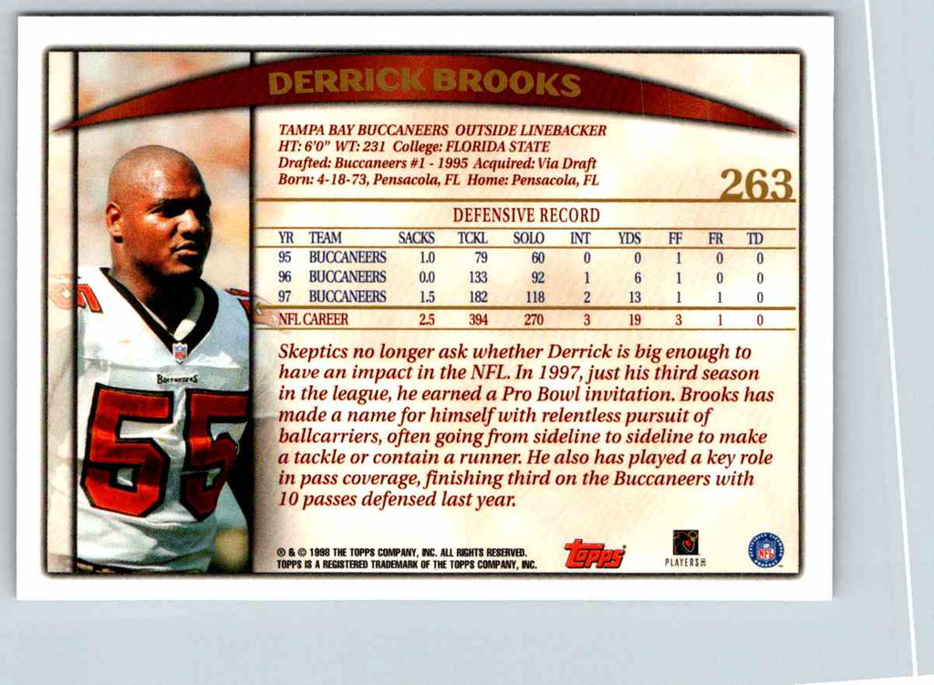 This 1998 Topps Derrick Brooks #263 card is a must-have for any football fan. Featuring a full-color head shot of the beloved NFL great, this card is sure to be a favorite in any collection. The back of the card lists Brooks' vital stats, including his height, weight, and date of birth. This card is perfect for any fan of the Tampa Bay Buccaneers, or any fan of the legendary Brooks. Add it to your collection today!