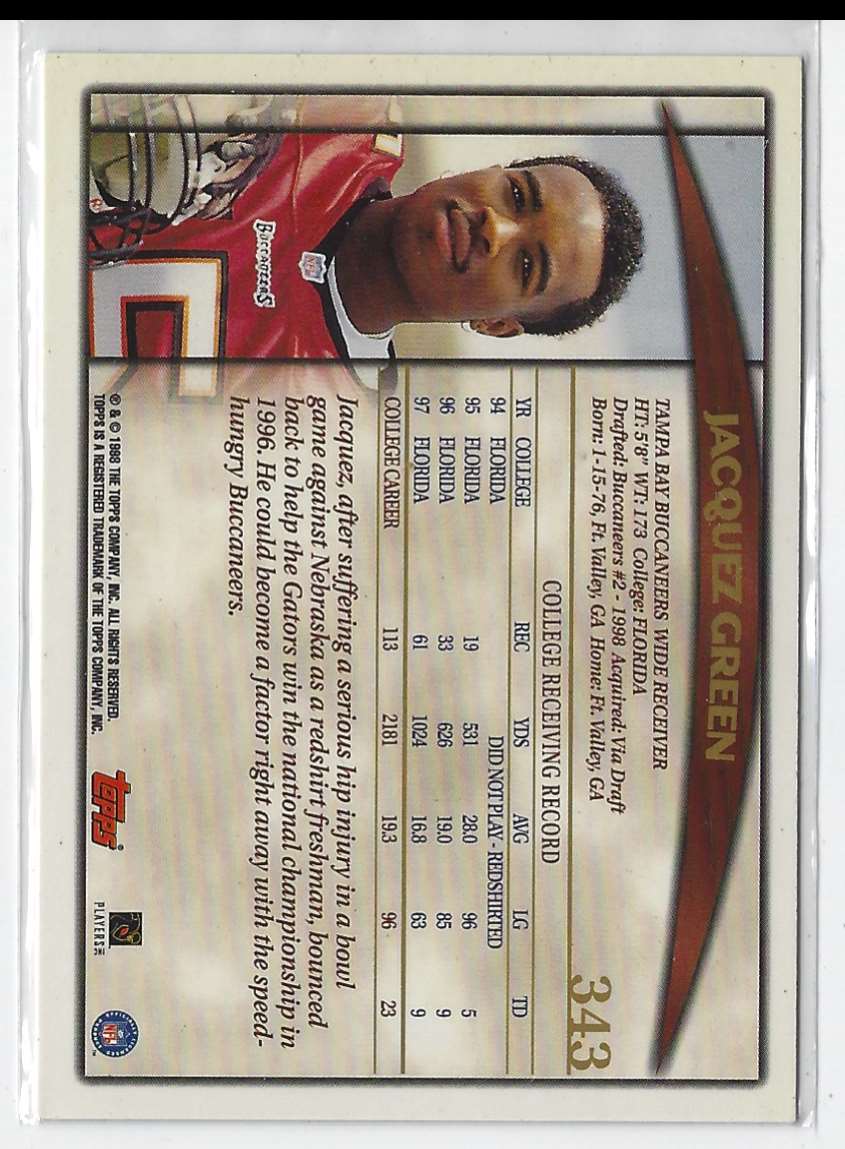 This 1998 Topps Jacquez Green #343Tampa Bay Buccaneers card is a great way to add a bit of excitement to your collection. Featuring Green in his iconic Buccaneers uniform, this card is sure to be a conversation starter. It's an essential part of any football fan's collection. With crisp, bright colors and a glossy finish, this card is sure to look great on display. Add this card to your collection and show your love for the Bucs!
