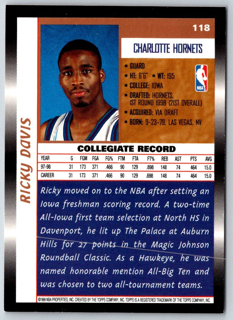 This 1998 Topps Ricky Davis #118 Charlotte Hornets card is a great addition to any collection! Featuring Davis in his purple and teal Hornets jersey, this card captures one of the best dunkers in the NBA in mid-dunk action. The crisp artwork and vibrant colors make this card a must-have for any Charlotte Hornets fan. Add this card to your collection today and show off your Hornets pride!