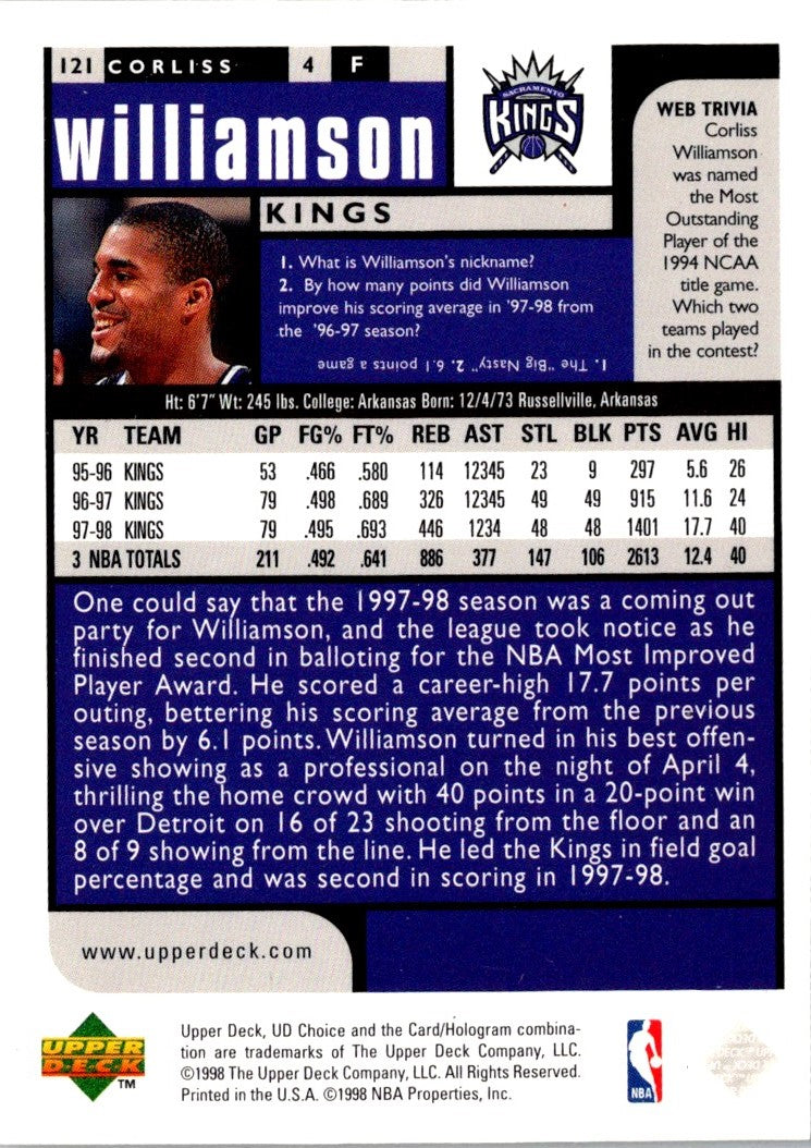 The 1998 UD Choice Corliss Williamson #121 is a must-have for any Sacramento Kings fan. This card features a great photo of Williamson and highlights his career accomplishments including being the 12th overall pick in the 1995 NBA Draft. Williamson was known for his tenacious defense and ability to score in the paint. He was an All-Star in 2002 and 2003, and his career averages of 13.4 points, 5.4 rebounds, and 2.2 assists per game reflect his skill as an all-around player. Add this card to your collection today and celebrate the amazing career of Corliss Williamson!