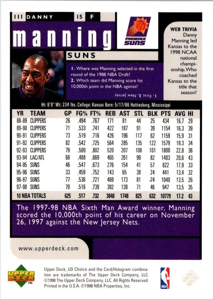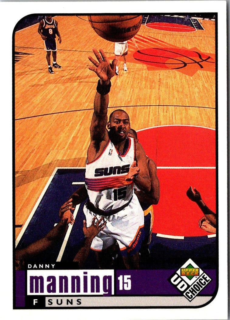 This 1998 UD Choice Danny Manning #111 Phoenix Suns card is the perfect addition to any basketball collection! Featuring an action shot capturing Manning in mid-air, the card is printed on high-quality cardstock and showcases vivid colors and an eye-catching design. A must-have for any Suns fan, this card is sure to be a treasured collectible!