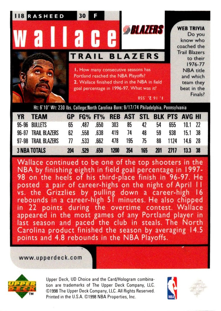 This 1998 UD Choice #118 Rasheed Wallace card is the perfect addition for any Portland Trail Blazers fan or collector! Featuring an action shot of the all-star forward, this card captures the essence of Rasheed Wallace's stellar 1998 season. Boasting an impressive record-setting season that included averaging 19.4 points and 8 rebounds per game, this card is a must-have for any basketball fan. Add this card to your collection today and relive the glory days of the Portland Trail Blazers!
