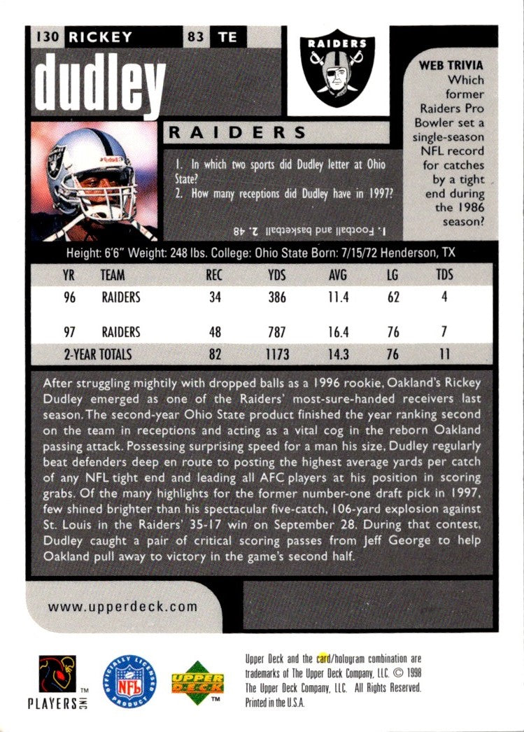 This 1998 UD Choice Rickey Dudley #130 Oakland Raiders card is the perfect addition to any sports card collection. Featuring vibrant colors and sharp corners, this card is sure to stand out. With a glossy finish and an action image of Rickey Dudley in full Raiders uniform, this card is the perfect way to commemorate a beloved Oakland Raiders player. Add this card to your collection today for a timeless piece of sports memorabilia.