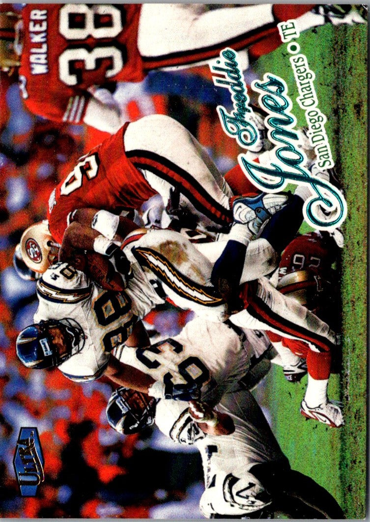 This 1998 Ultra Freddie Jones #174 San Diego Chargers card is a must-have for any Chargers fan. With a glossy surface and vibrant colors, this card is sure to make a great addition to any collection. Featuring a portrait of the legendary Freddie Jones, it is the perfect way to celebrate the Chargers' storied past. With sharp corners and no bends or creases, this card is in excellent condition and ready for display. Be sure to add this to your collection today!