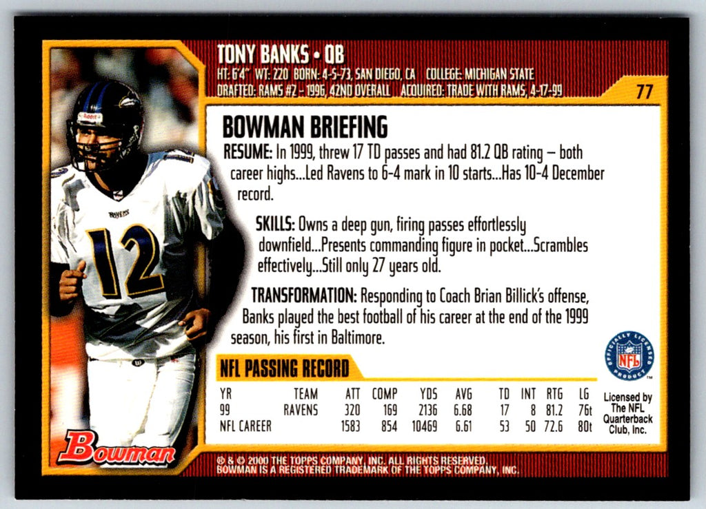 This 2000 Bowman Tony Banks #77 card features a great action shot of the Baltimore Ravens quarterback. With bold colors and sharp lines, this card is a must-have for any Tony Banks fan. It is also a great way to remember the great career he had with the Ravens. Add this card to your collection today and commemorate one of the greatest quarterbacks to ever wear a Ravens uniform.