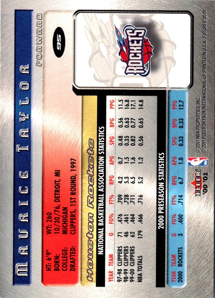 This 2000 Fleer Futures Maurice Taylor #95 Houston Rockets card is a great addition to any card collection! It is printed on a glossy stock and features a full-color image of Maurice Taylor in his Houston Rockets uniform. The back of the card provides detailed information about Maurice Taylor's career stats and accomplishments. It's the perfect way to show your support for one of the Rockets' most beloved players! Add this card to your collection today and relive the greatness of Maurice Taylor!