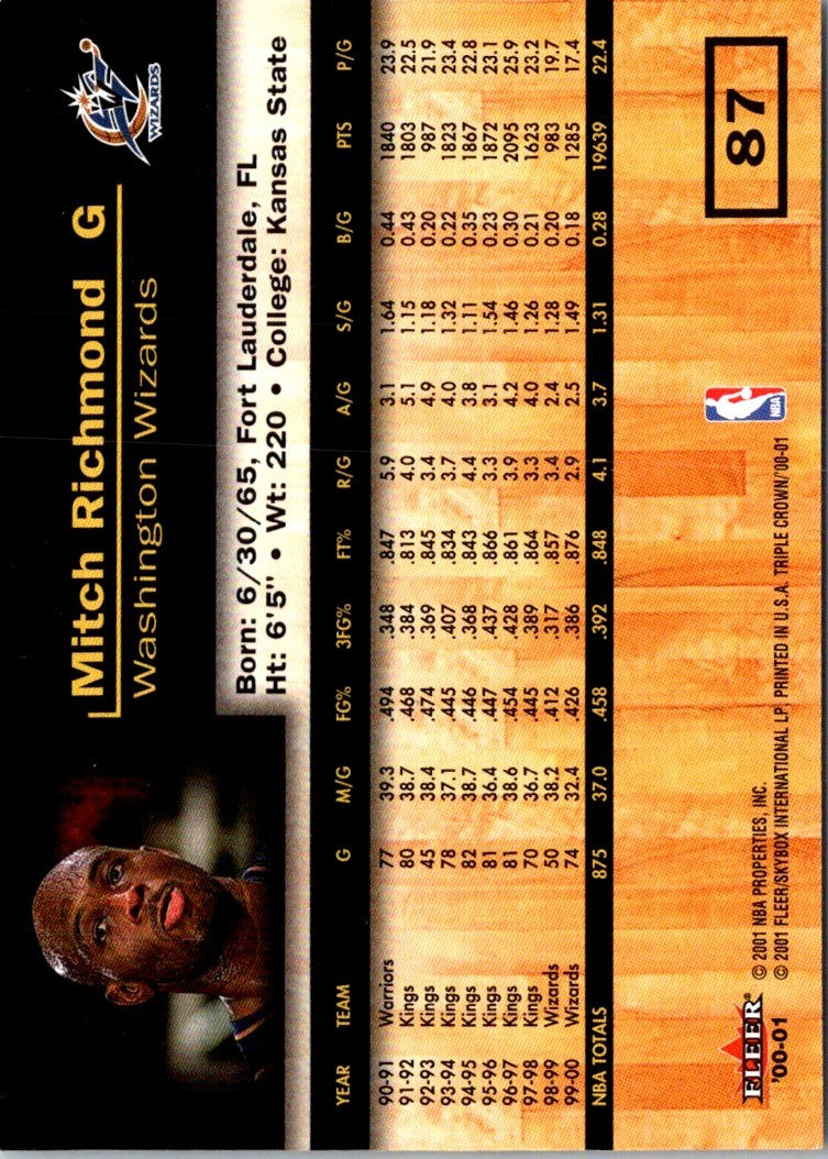 This 2000 Fleer Triple Crown Mitch Richmond #87 Washington Wizards card is a great addition to any basketball card collection. It features a detailed, full color photo of Richmond in his Washington Wizards uniform. A great way to show your support for one of the greats of the game. The card is printed on quality stock, and is sure to last for years to come. Add this card to your collection today and show your appreciation for a true basketball legend.