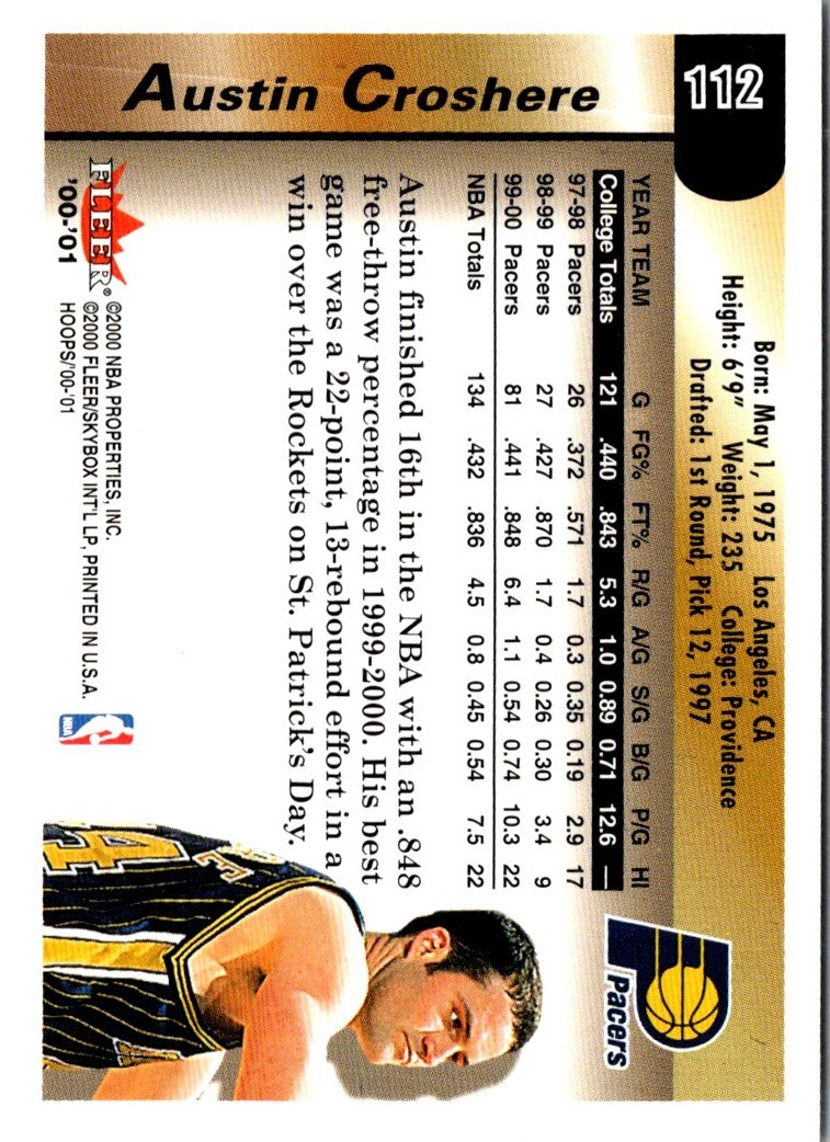 The 2000 Hoops Hot Prospects Austin Croshere #112 Indiana Pacers card is a must-have for any Pacers fan. Showcasing the sleek design and detailed artwork of Hoops, the card features a full-color action shot of Croshere in his iconic Pacers jersey. With stats listed on the back, it's a great way to commemorate the start of a successful career for the 6-foot-10 forward. Add this card to your collection today and celebrate the legacy of one of Indiana's all-time greats.