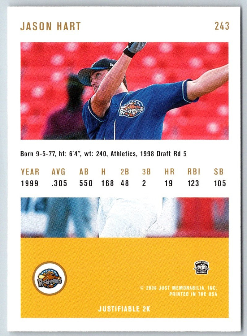 This 2000 Just Jason Hart #243Midland Rockhounds card is a must-have for any baseball fan. Show your support for the Midland Rockhounds with this collectible card. Featuring a full-color action photo of Jason Hart, this card is sure to be a great addition to any collection. With high-quality paper and vibrant colors, this card is an excellent way to show your admiration for your favorite team. Show your pride and support for the Midland Rockhounds with the 2000 Just Jason Hart #243Midland Rockhounds card.