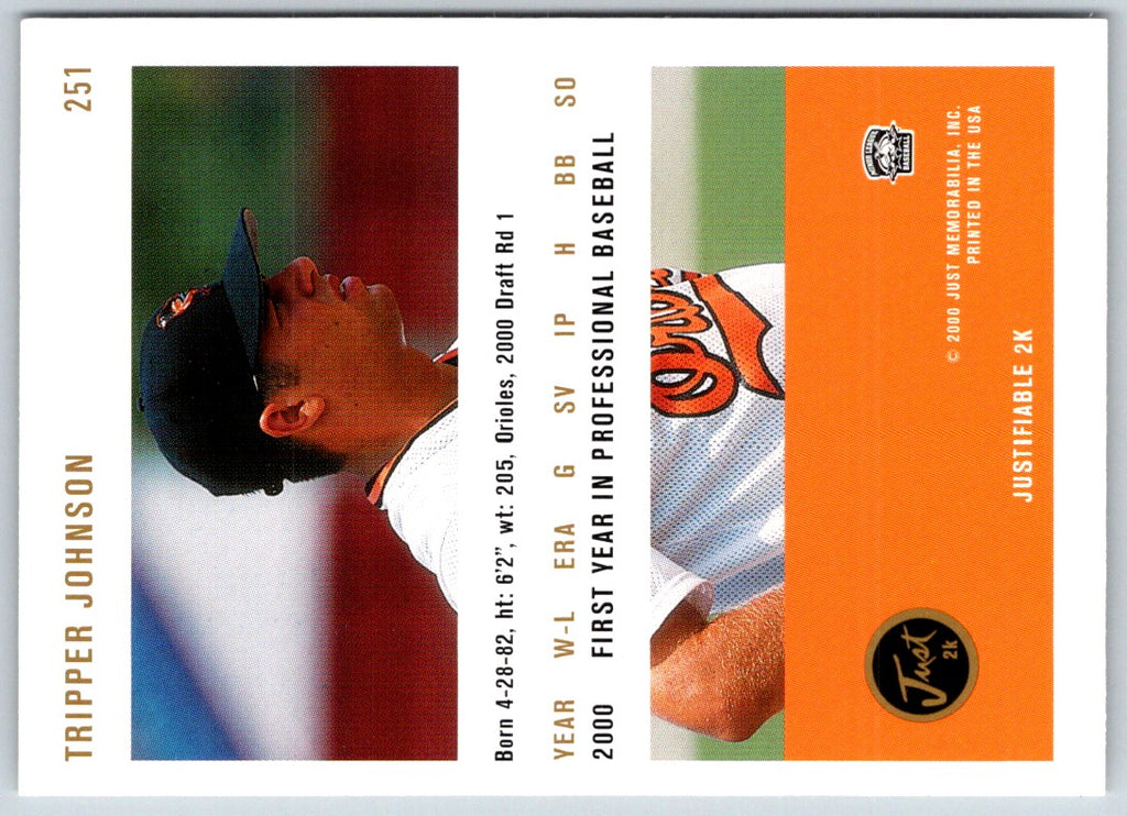 The 2000 Just Tripper Johnson #251GCL Orioles is a must-have for any Orioles fan. This card features a full-color photo of Tripper Johnson in his iconic Orioles uniform. The card also includes detailed stats and information about Tripper Johnson's career with the Orioles. It's a great collectible to add to your Orioles card collection! With this card, you can proudly display your Orioles pride and celebrate the legacy of Tripper Johnson. Get your 2000 Just Tripper Johnson #251GCL Orioles today!
