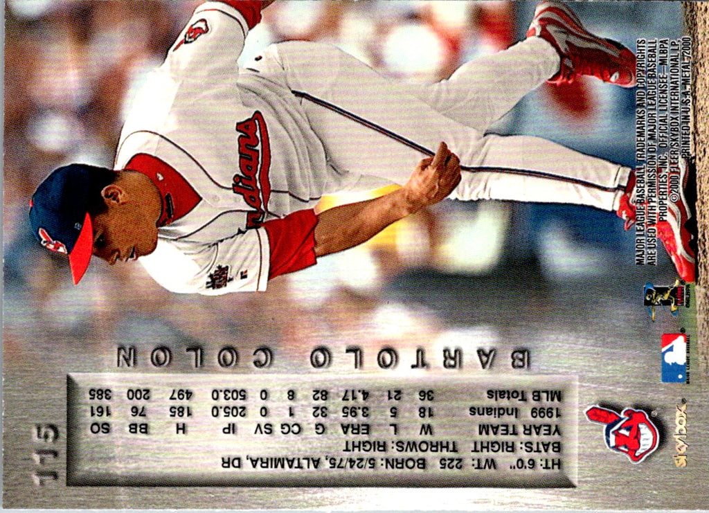 This 2000 Metal Bartolo Colon #115 Cleveland Indians card is a must-have for any Indians fan or baseball card collector. Featuring a classic photo of Bartolo Colon in his Indians uniform, this card is sure to make any collection stand out. The card is made of high-quality metal, with a glossy finish that will last for years to come. With a great design and a durable construction, this card is perfect for the sports fan who wants to add a special touch to their collection.