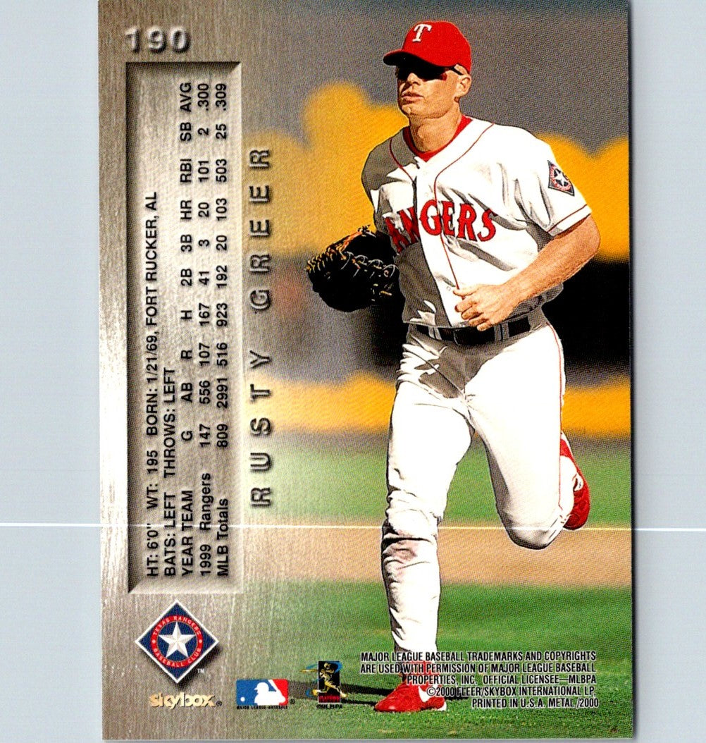 This 2000 Metal Emerald Rusty Greer #190Texas Rangers card will be sure to add a little extra sparkle to your collection! Featuring a full-colour image of Rusty Greer on the front, this card is sure to please all fans of the Texas Rangers. The back of the card features a detailed stats section that includes Greer's batting average, home runs, and RBIs. This card is a great way to show your support for Greer and the Rangers, and it's a great addition to any collection!