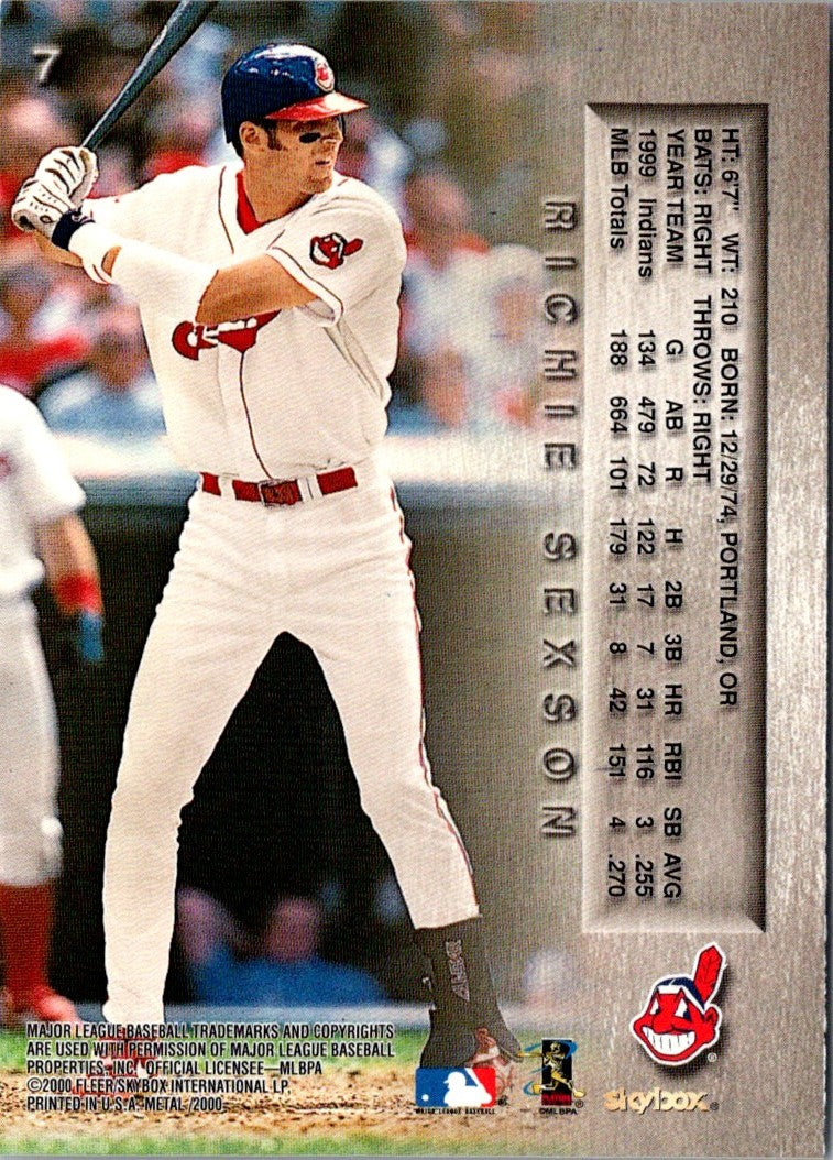 This 2000 Metal Richie Sexson #7 Cleveland Indians card is a must-have for any baseball fan! It features a colorful design and a full-color image of Richie Sexson in his Indians uniform. This card is an excellent way to commemorate Sexson's tenure with the Indians. The card is printed on high-quality metal and is sure to last for many years. It is an ideal item for any fan's collection or display. Add this card to your collection and honor the great Richie Sexson!