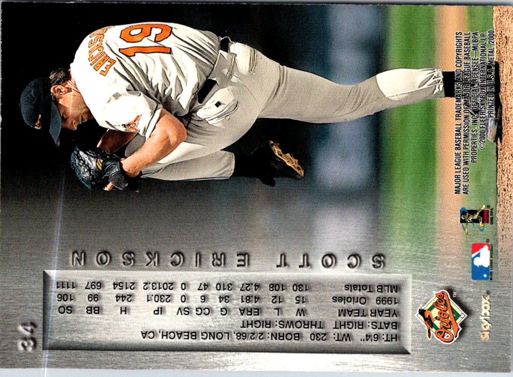 This 2000 Metal Scott Erickson #34 Baltimore Orioles collectible card is perfect for any Orioles fan or card collector! This card features a high-quality image of Scott Erickson in his Orioles uniform on the front, and career stats and accomplishments on the back. It also features a hologram sticker from the MLB on the back, guaranteeing authenticity. This classic card is a must-have for any serious collector!