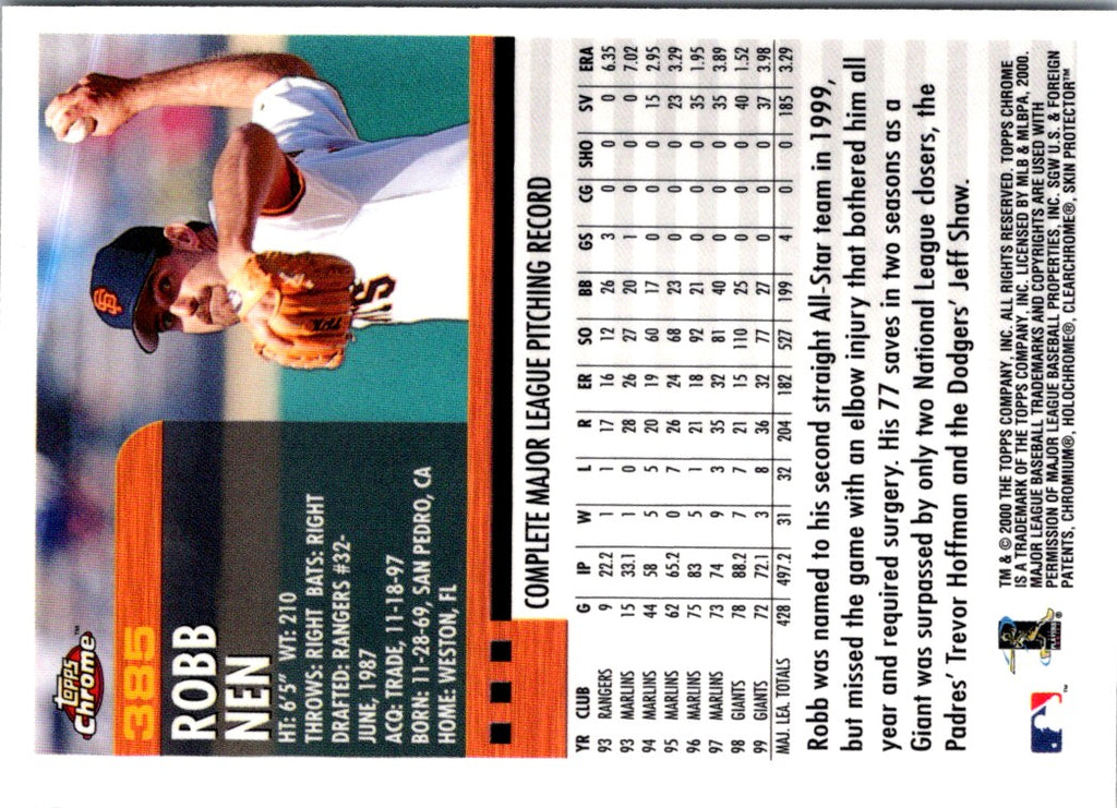 This 2000 Pacific Robb Nen #385 San Francisco Giants card is a must-have for any collector! Featuring a high-quality, glossy finish, this card showcases an action shot of Robb Nen in his San Francisco Giants uniform. The back of the card displays an overview of Nen's career stats and accomplishments, making it a great way to commemorate the pitching great. Add this card to your collection today!